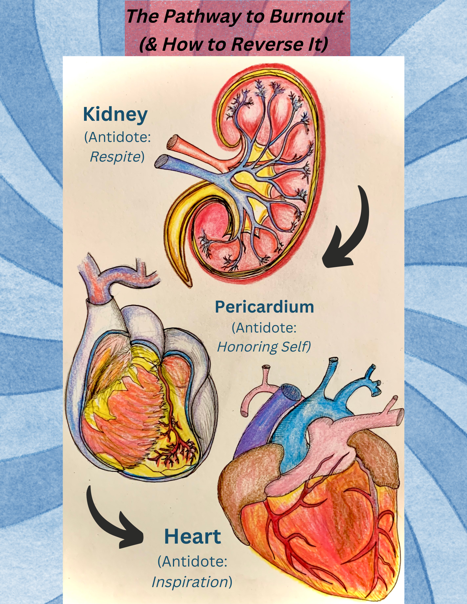 This illustration depicts the organs that are affected by burnout: first, the Kidney; leading to the pericardium; and finally landing in the heart. “There are no heart-attacks, only kidney attacks” is a phrase that illustrates the energetic interconnection of these organs. To reverse this effect of burnout, we turn to the antidotes: respite; honoring self; and inspiration, respectively.